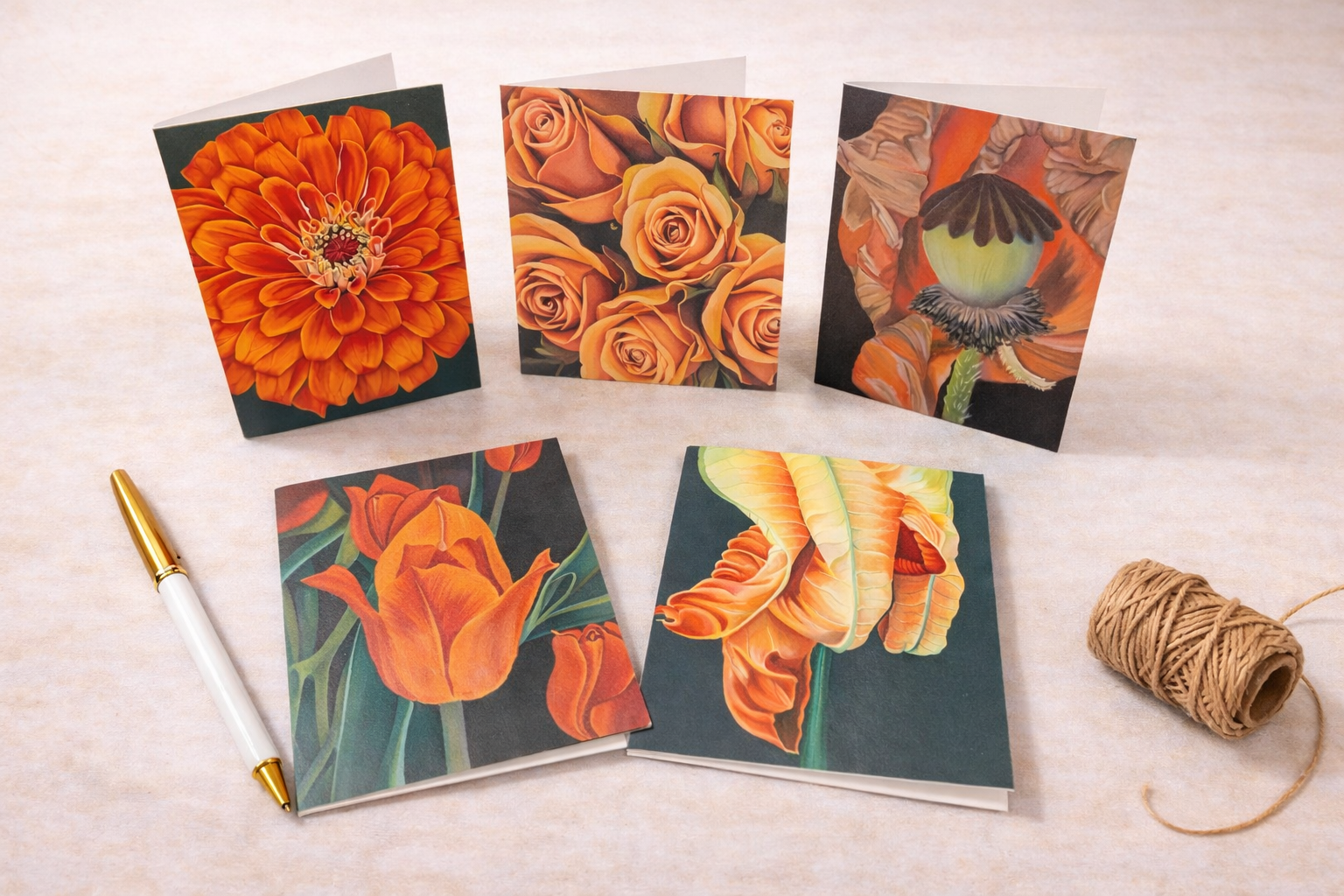 A vibrant collection of floral paintings in rich oranges, coral hues, and warm earth tones. These cards are well suited for messages of gratitude, encouragement, or moments that call for energy and connection.