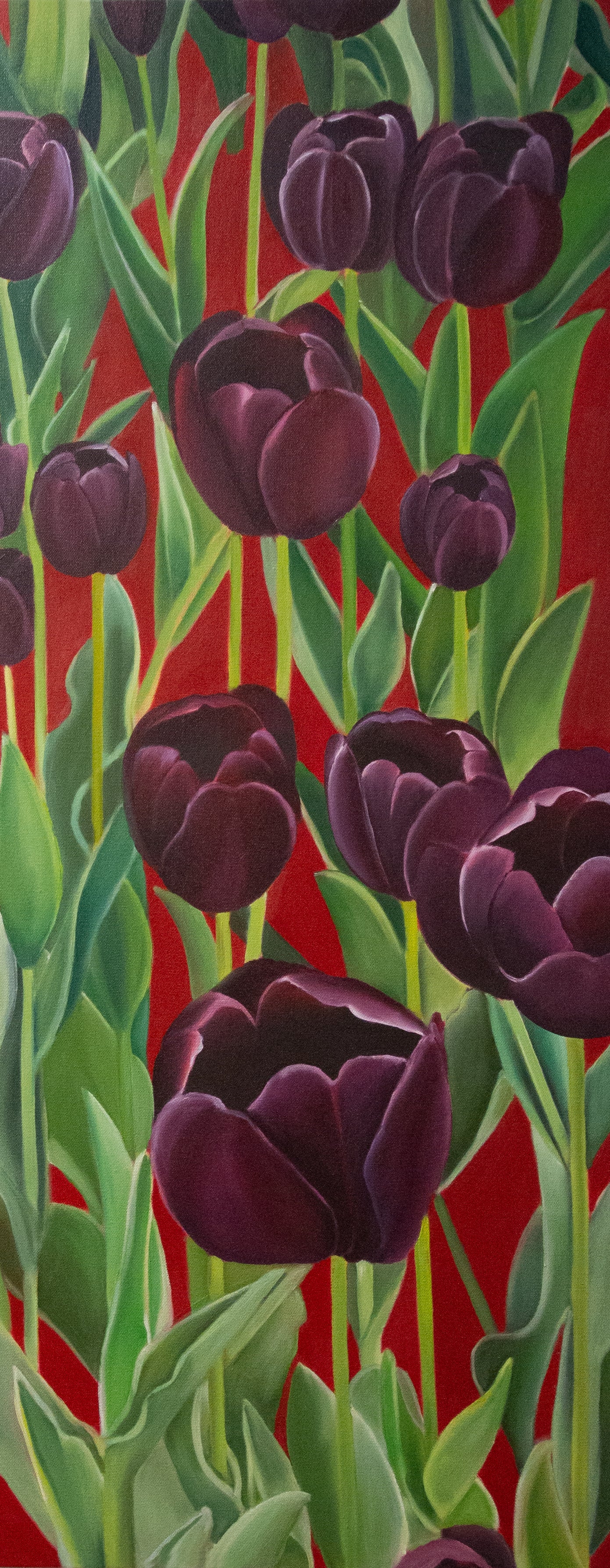 There’s something powerful about the way these purple tulips rise against a bold red background. With their rich color and graceful form, they seem to hold their own kind of quiet strength. The tall composition lets them stretch upward, like they’re reaching toward something greater, grounded, yet full of purpose.