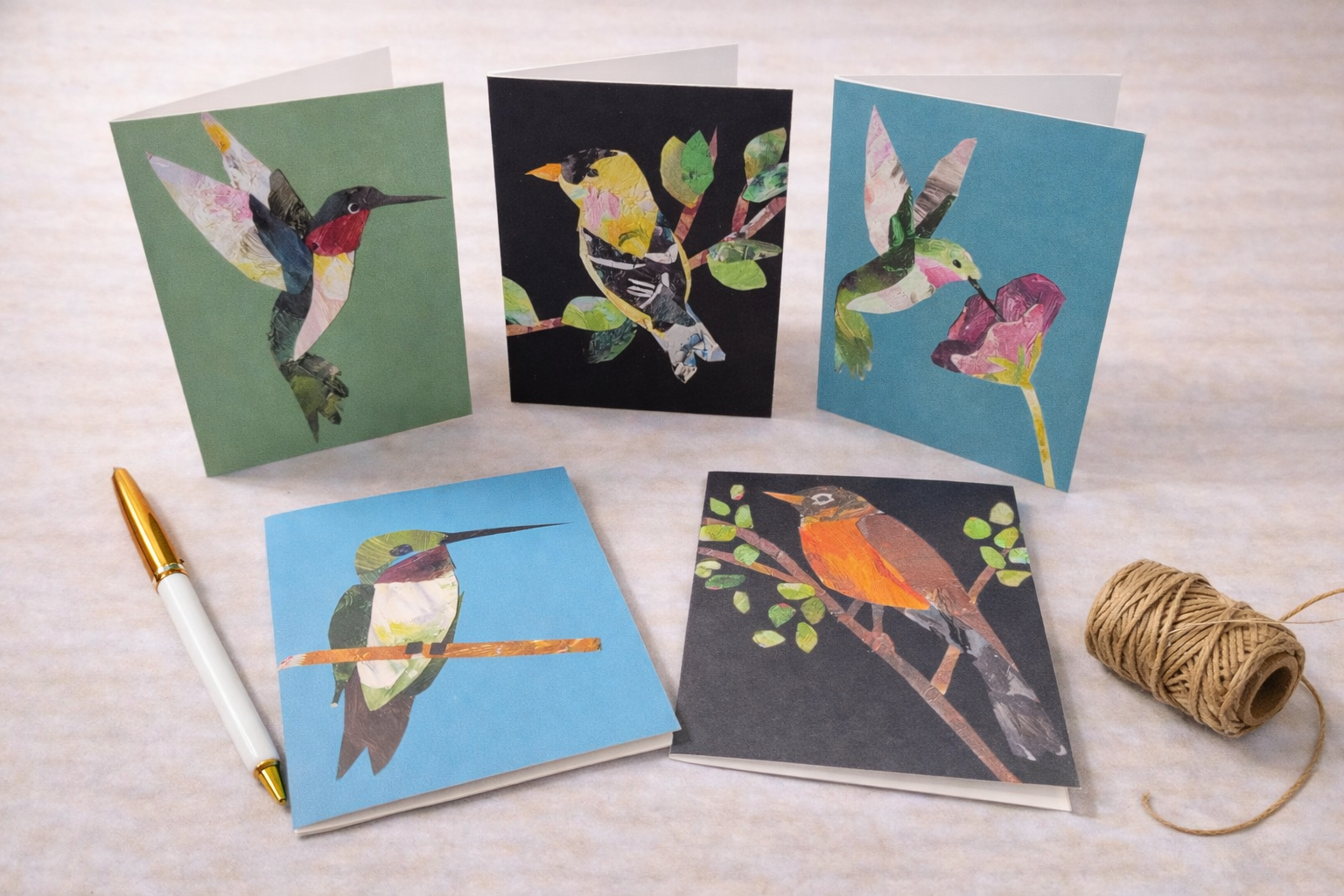 A lively and expressive collection featuring birds rendered through layered collage and painterly mark-making. These designs celebrate movement, personality, and the quiet joy found in observing nature up close. Well suited for everyday correspondence, thoughtful notes, or sending a small moment of delight.